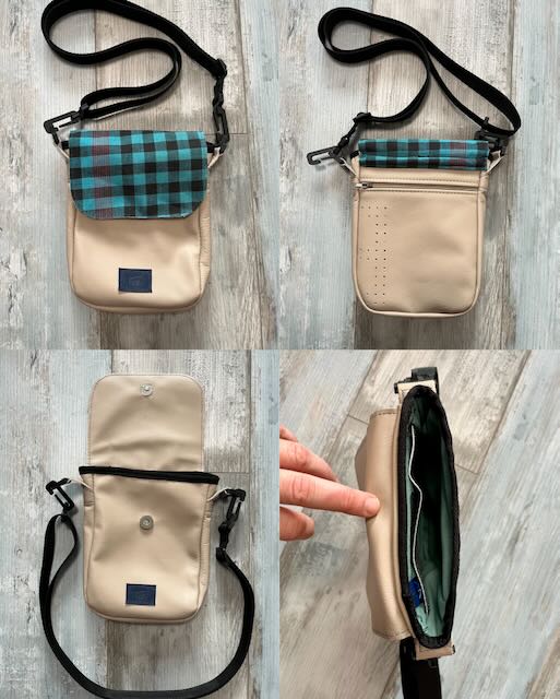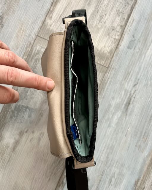 Die Klapptasche ist innen mit einem passenden Stoff ausgekleidet. Der Riemen lässt sich in der Länge verstellen, so dass die Klapptasche kurz unter der Achsel aber auch auf der Hüfte getragen werden kann. Der Riemen ist mit 2 Karabinern befestigt und kann getauscht werden (maximale Länge des Trageriemens 1,4 m).